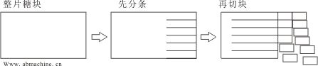 411切块机,可用于切割牛轧糖,牛皮糖,米花糖等,前道工序压成整个大糖块,送到411牛皮糖切割机上,自动分切成条,同时切成块状,大小,厚薄都可适应,例如7厘米厚的米花糖块可以切成1.2厘米*7厘米的小片,2.5厘米厚的牛轧糖块,切成2.5*2.5厘米的小糖块,同时也可根据客户的要求做改动,和前道工序紧密连接,实现自动生产。