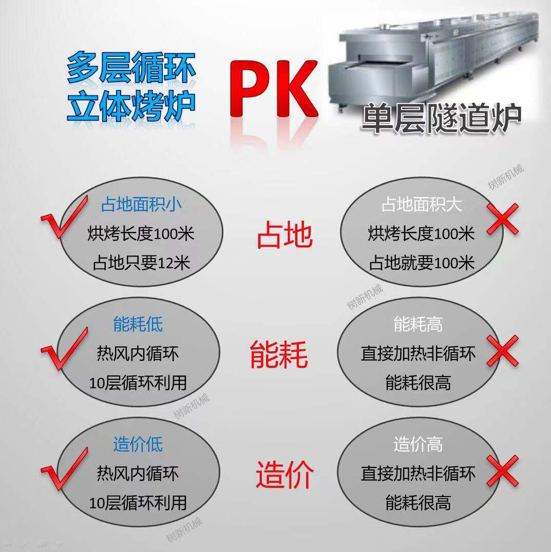 占地小:烤炉是10层循环的结构,占地只有循环长度的1/10,大大节约了车间场地